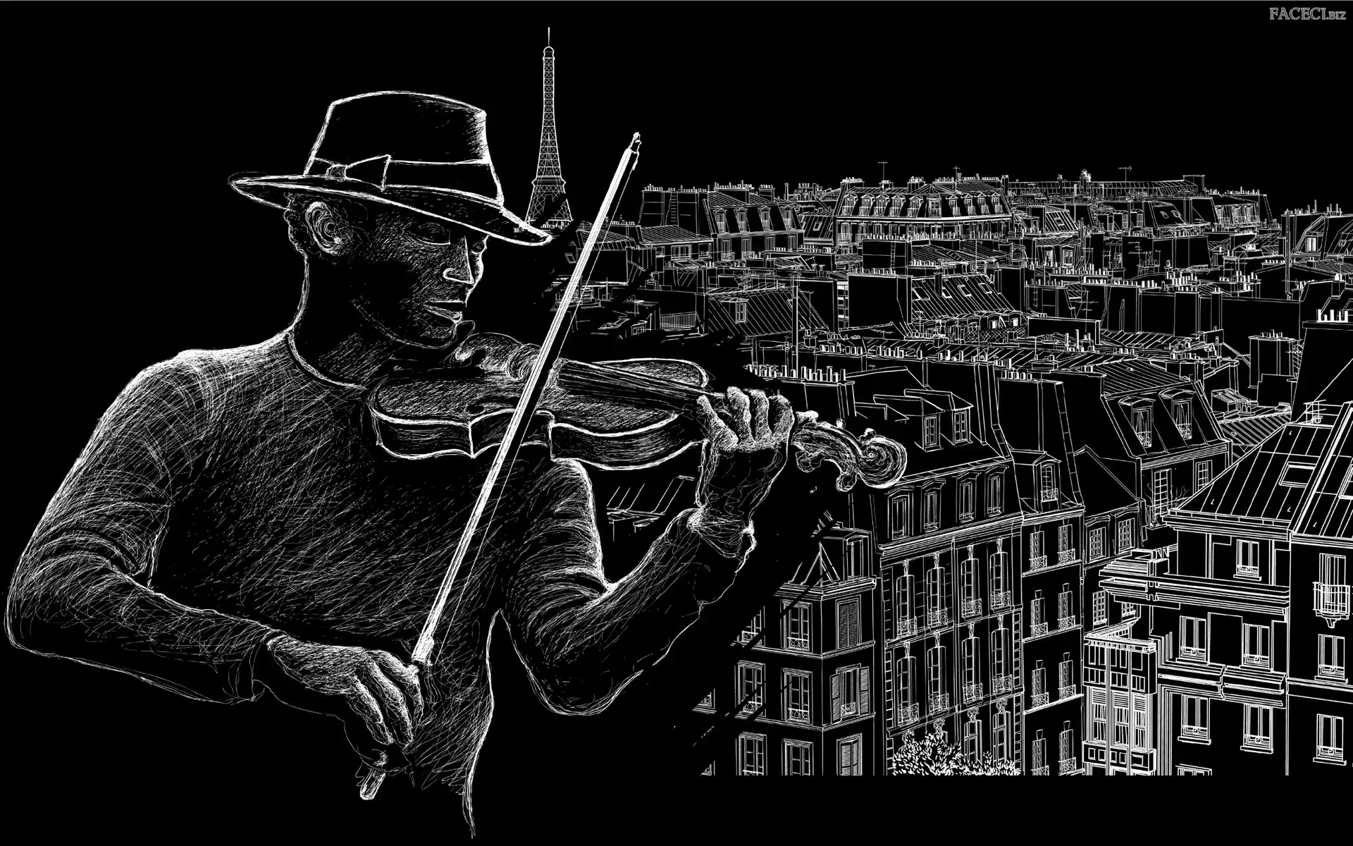 Miasta, Panorama, Mężczyzna, Grafika, Skrzypce - faceci.biz